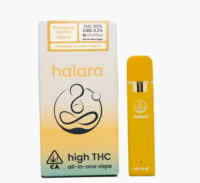 Pineapple Express, Hybrid 90+% THC | <1% CBD | CBG Inspired by Pineapple Express Flavor: Sweet tropical pineapple, refreshing coconut and subtle creamy and cinnamon undertones. Aroma: Grilled pineapple and island spice Feeling: Euphoric and Refreshed The exceptional oil quality you expect from Halara, now in an all-in-one ready for life’s adventures. Auto-draw - no on/off button. Comes charged - rechargeable with USB-C cable. Features two carb holes on side of device - cover one for bigger hits and improved airflow. Grab one and go! When you are done, don’t forget to recycle your vape cartridge through our recycling program. Find your closest partner retailer on our locator map: https://www.google.com/maps/d/u/0/edit?mid=1PHAB1coFwCKMIMVuXBK0Fs2G6OFtbO8&usp=sharing Learn more about our Recycling Program here: https://www.gohalara.com/recycling-program Remember: An empty integrated cannabis vaporizer shall be properly disposed of as hazardous waste at a household hazardous waste collection facility or other approved facility. Flavors Pineapple Citrus Tropical Effects & flavors are reported by users on our site. This is for informational purposes only and not intended as medical advice. Please consult your physician before changing any medical treatment.Doses: 1 G