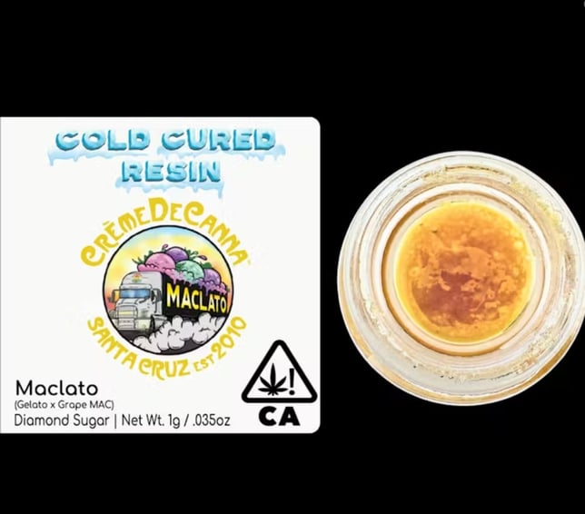 Sum Cannabinoids: 86.1% Total Cannabinoids: 76.3% Total THC: 72.9% Total CBD: % Total THCa: 77.10% Total THC/pkg: 728.8 mg Total CBD/pkg: <1mg Total Terpenes: 4.22% Terpenes: Caryophyllene Limonene Humulene Linalool Myrcene Package Date: 05/23/2025 Creme's Cold Cured Resin captures peak freshness and potency through a meticulous cold extraction and storage process, locking in vibrant terpenes for an unparalleled flavor experience. Cold Cured. Flavor Secured. Maclato is an indulgent Indica dominant hybrid crafted from the beloved MAC lineage, known for its rich potency and balanced effects. Its aroma is a decadent fusion of creamy vanilla, toasted nuts, and a hint of citrus zest, delivering a smooth and flavorful experience that lingers on the palate. Perfect for unwinding, this extract wraps you in soothing relaxation while keeping your mind clear and inspired, making it an ideal choice for both creative bursts and mellow evenings.
