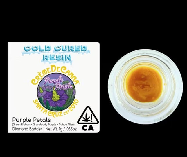 Creme's Cold Cured Resin captures peak freshness and potency through a meticulous cold extraction and storage process, locking in vibrant terpenes for an unparalleled flavor experience. Cold Cured. Flavor Secured. Purple Petals is a hybrid crafted from a carefully bred lineage of vibrant purple cultivars known for their rich terpene expression. Its aroma blooms with sweet berry notes, gentle floral undertones, and a velvety hint of earth that lingers like a warm sunset. Expect a soothing, mood‑brightening experience that melts tension, nurtures creativity, and wraps the body in a calm, uplifting glow perfect for unwinding or easing into a peaceful flow.Enjoy Creme!