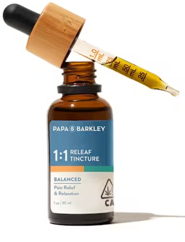 "CBD and THC balanced oil for whole body comfort. The 1:1 Releaf Tincture is balanced with equal parts CBD and THC and is great for those looking for whole-body comfort and a balanced state of mind. Ideal for cannabis consumers who are comfortable with THC. Crafted with the utmost simplicity, containing only two ingredients: MCT oil and cannabis, this tincture can start to take effect within just 15 minutes, offering a natural and quick-acting solution to enhance both body and mind. Papa & Barkley’s tinctures are vegan and fast-metabolizing, with a customizable dosage experience, carefully crafted with whole-plant extraction. Our solventless, chemical-free infusion process preserves the plant’s full spectrum of cannabinoids, terpenes, and phytonutrients for maximum therapeutic benefits. Product Cannabinoids: 450mg (225mg CBD, 225mg THC) 900mg (450mg CBD, 450mg THC) Product Weight: 15ml, 0.5oz 30ml, 1.0oz Ingredients: MCT Oil, Cannabis Contains: Tree Nut (Coconut). Does not contain: Soy, Peanuts, Wheat, Gluten, Dairy, Preservatives, Artificial Colors, Artificial Flavors or Sweeteners Directions: Start with 0.25ml dose under the tongue and hold for at least 20 seconds, then swallow. This statement has not been evaluated by the Food and Drug Administration. This product is not intended to diagnose, treat, cure, or prevent any disease.""CBD and THC balanced oil for whole body comfort. The 1:1 Releaf Tincture is balanced with equal parts CBD and THC and is great for those looking for whole-body comfort and a balanced state of mind. Ideal for cannabis consumers who are comfortable with THC. Crafted with the utmost simplicity, containing only two ingredients: MCT oil and cannabis, this tincture can start to take effect within just 15 minutes, offering a natural and quick-acting solution to enhance both body and mind. Papa & Barkley’s tinctures are vegan and fast-metabolizing, with a customizable dosage experience, carefully crafted with whole-plant extraction. Our solventless, chemical-free infusion process preserves the plant’s full spectrum of cannabinoids, terpenes, and phytonutrients for maximum therapeutic benefits. Product Cannabinoids: 450mg (225mg CBD, 225mg THC) 900mg (450mg CBD, 450mg THC) Product Weight: 15ml, 0.5oz 30ml, 1.0oz Ingredients: MCT Oil, Cannabis Contains: Tree Nut (Coconut). Does not contain: Soy, Peanuts, Wheat, Gluten, Dairy, Preservatives, Artificial Colors, Artificial Flavors or Sweeteners Directions: Start with 0.25ml dose under the tongue and hold for at least 20 seconds, then swallow. This statement has not been evaluated by the Food and Drug Administration. This product is not intended to diagnose, treat, cure, or prevent any disease."