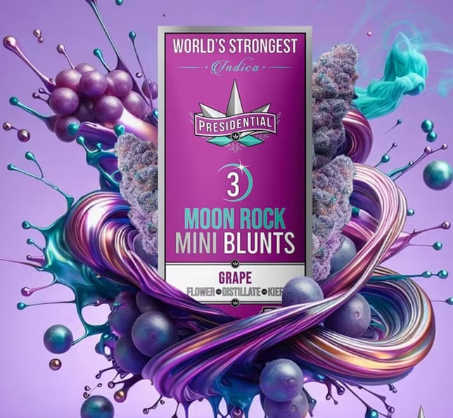 Your Presidential Pee-Wee Blunts consist of Top-Shelf Organic Flower INFUSED with Premium THC Distillate and then Coated in the Highest Quality Kief. Our innovative proprietary infusion process enables us to permeate the flower all the way to the stem! Our Moonrocks our ground and wrapped in a 100% tobacco FREE blunt wrap! Presidential is committed to creating the most innovative, highest quality cannabis products guaranteed to deliver a reliable and consistent dose with each use. *Each Pack of Pee-Wees come with 3 Mini (0.7g) Moon Rock blunts inside