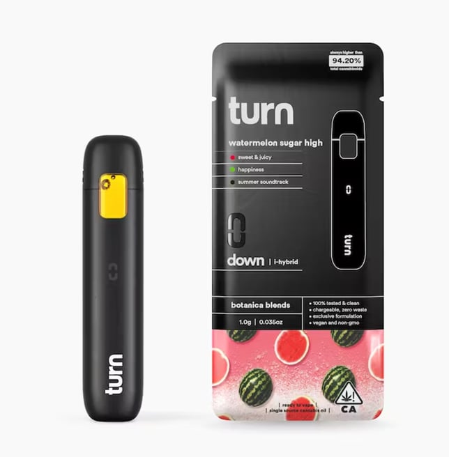 Vacation’s all I ever wanted…! Sweet and refreshing with a distinctive fruity flavor that’ll whisk you somewhere tropical, this smooth operator has been known to relax and stimulate. Get ready to have a deep philosophical chat or bust out the hammock and watch the clouds go by. This versatile strain is popular for sparking new ideas or getting a fresh perspective on old ones. farm to table - happiness - summer soundtrack turn botanica blends You'll only get clean, fresh, guaranteed pure California goodness from seed to pen. Choose from a wide selection of our high potency, exclusive, hand-curated botanica blend formulations to get the perfect floaty feeling you're looking for. // oil highlights // Single source California fresh grown Tested and verified clean Vegan, non-GMO, ultra pure Natural botanical terpenes turnpen disposables pack a big punch. With abundant clouds, consistent pulls, and 100% live window view, this pen is practically perfect in every way. No cotton, glue, or heavy metals - ever. Free and easy airflow, 1.0 ml oil capacity, USB-C rechargeable, 150 puffs per charge, 1-year disposable, LED display, and clearview window so you never miss a drop. Powerful to the last puff, clean, convenient, pocket-comfy, with no buttons, no BS. Vacation’s all I ever wanted…! Sweet and refreshing with a distinctive fruity flavor that’ll whisk you somewhere tropical, this smooth operator has been known to relax and stimulate. Get ready to have a deep philosophical chat or bust out the hammock and watch the clouds go by. This versatile strain is popular for sparking new ideas or getting a fresh perspective on old ones. farm to table - happiness - summer soundtrack turn botanica blends You'll only get clean, fresh, guaranteed pure California goodness from seed to pen. Choose from a wide selection of our high potency, exclusive, hand-curated botanica blend formulations to get the perfect floaty feeling you're looking for. // oil highlights // Single source California fresh grown Tested and verified clean Vegan, non-GMO, ultra pure Natural botanical terpenes turnpen disposables pack a big punch. With abundant clouds, consistent pulls, and 100% live window view, this pen is practically perfect in every way. No cotton, glue, or heavy metals - ever. Free and easy airflow, 1.0 ml oil capacity, USB-C rechargeable, 150 puffs per charge, 1-year disposable, LED display, and clearview window so you never miss a drop. Powerful to the last puff, clean, convenient, pocket-comfy, with no buttons, no BS.