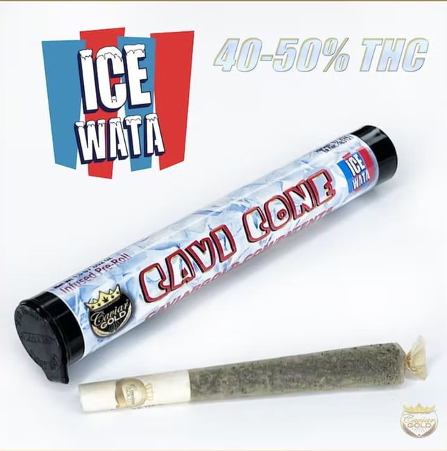 From the sweet berry scents to its quenching fruity flavor, Ice Wata Infused Preroll by Caviar Gold is the slushie in a joint! Smooth hits and thick clouds bring on fast-building fades and a cheerful experience from this Indica blend. More THC, less air! Infused with 98% pure liquid THC, so you get a high dosage of relaxed and creative effects.