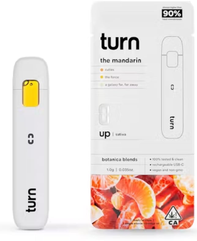 Creative pursuits, meet your tangerine dream. Temper a racing mind without stifling a busy body and relish in concentrated purpose. Creamy orange, sweet vanilla, and a whisper of peppery goodness come together for decadence that isn’t overpowering. Go on, hike to the waterfall and paint it orange. cuties - the force - a galaxy far, far away turn botanica blends You'll only get clean, fresh, guaranteed pure California goodness from seed to pen. Choose from a wide selection of our high potency, exclusive, hand-curated botanica blend formulations to get the perfect floaty feeling you're looking for. // oil highlights // Single source California fresh grown Tested and verified clean Vegan, non-GMO, ultra pure Natural botanical terpenes turnpen disposables pack a big punch. With abundant clouds, consistent pulls, and 100% live window view, this pen is practically perfect in every way. No cotton, glue, or heavy metals - ever. Free and easy airflow, 1.0 ml oil capacity, USB-C rechargeable, 150 puffs per charge, 1-year disposable, LED display, and clearview window so you never miss a drop. Powerful to the last puff, clean, convenient, pocket-comfy, with no buttons, no BS.Creative pursuits, meet your tangerine dream. Temper a racing mind without stifling a busy body and relish in concentrated purpose. Creamy orange, sweet vanilla, and a whisper of peppery goodness come together for decadence that isn’t overpowering. Go on, hike to the waterfall and paint it orange. cuties - the force - a galaxy far, far away turn botanica blends You'll only get clean, fresh, guaranteed pure California goodness from seed to pen. Choose from a wide selection of our high potency, exclusive, hand-curated botanica blend formulations to get the perfect floaty feeling you're looking for. // oil highlights // Single source California fresh grown Tested and verified clean Vegan, non-GMO, ultra pure Natural botanical terpenes turnpen disposables pack a big punch. With abundant clouds, consistent pulls, and 100% live window view, this pen is practically perfect in every way. No cotton, glue, or heavy metals - ever. Free and easy airflow, 1.0 ml oil capacity, USB-C rechargeable, 150 puffs per charge, 1-year disposable, LED display, and clearview window so you never miss a drop. Powerful to the last puff, clean, convenient, pocket-comfy, with no buttons, no BS.