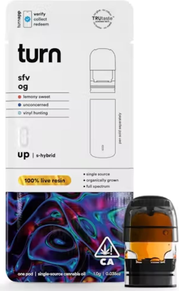 Welcome to the uncanny valley. This San Fernando Valley icon is the parent to numerous hybrids thanks to its stable, classic kush origins. Folks favor it for aromatic notes of earthy pine, pungent — sometimes harsh — herbal flavor, and tapered sedation for a decompression session. lemony sweet - unconcerned - vinyl hunting turn 100% live resin comes from a fresh-frozen cannabis plant that's never dried. That way, it retains its natural terpenes and compounds for a floaty, fantastic entourage effect. Our process is meticulous in preserving the delicate flower and leaves you with an oil boasting all the fragrances and flavors the good earth intended. // oil highlights // Single source California fresh grown Tested and verified clean Vegan, non-GMO, ultra pure No cut, no filler, all plant turn pods are crafted with care + maximum intention What's worse than incredible oil ruined by a pen that's too hot or not hot enough? Paying $$ for it. We engineered turn pods to treat your oil like the VIP it is. Precise heating tech treats various viscosities. No buttons, no guesswork, no user error. Perfectly calibrated design for free and easy airflow. Flavors Earthy Lemon CitrusWelcome to the uncanny valley. This San Fernando Valley icon is the parent to numerous hybrids thanks to its stable, classic kush origins. Folks favor it for aromatic notes of earthy pine, pungent — sometimes harsh — herbal flavor, and tapered sedation for a decompression session. lemony sweet - unconcerned - vinyl hunting turn 100% live resin comes from a fresh-frozen cannabis plant that's never dried. That way, it retains its natural terpenes and compounds for a floaty, fantastic entourage effect. Our process is meticulous in preserving the delicate flower and leaves you with an oil boasting all the fragrances and flavors the good earth intended. // oil highlights // Single source California fresh grown Tested and verified clean Vegan, non-GMO, ultra pure No cut, no filler, all plant turn pods are crafted with care + maximum intention What's worse than incredible oil ruined by a pen that's too hot or not hot enough? Paying $$ for it. We engineered turn pods to treat your oil like the VIP it is. Precise heating tech treats various viscosities. No buttons, no guesswork, no user error. Perfectly calibrated design for free and easy airflow. Flavors Earthy Lemon Citrus