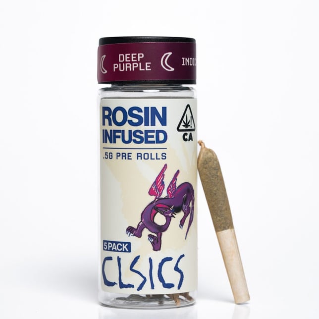 Deep Purple was bred to showcase the best traits from Purple Urkle and Querkle and highlight that iconic grape taste. Deep Purple’s the kind of weed that'll make you want to paint your room a dozen shades of purple, set up a lava lamp, and just vibe out. Imagine a bed of fluffy grape-flavored clouds with a hint of earthy goodness. This strain's got those deep, dark, purp vibes that feels like a blacklight poster come to life. All CLSICS rosin infused pre rolls are handcrafted from start to finish. These products begin with carefully curated strain specific cannabis which is then infused with our in house processed fresh frozen ice water hash rosin extracted from meticulously procured strains selected for their unique terpene profiles to deliver a delicious, mouthwatering connoisseur level solventless experience. Flavors Grape Earthy FloweryDeep Purple was bred to showcase the best traits from Purple Urkle and Querkle and highlight that iconic grape taste. Deep Purple’s the kind of weed that'll make you want to paint your room a dozen shades of purple, set up a lava lamp, and just vibe out. Imagine a bed of fluffy grape-flavored clouds with a hint of earthy goodness. This strain's got those deep, dark, purp vibes that feels like a blacklight poster come to life. All CLSICS rosin infused pre rolls are handcrafted from start to finish. These products begin with carefully curated strain specific cannabis which is then infused with our in house processed fresh frozen ice water hash rosin extracted from meticulously procured strains selected for their unique terpene profiles to deliver a delicious, mouthwatering connoisseur level solventless experience. Flavors Grape Earthy Flowery