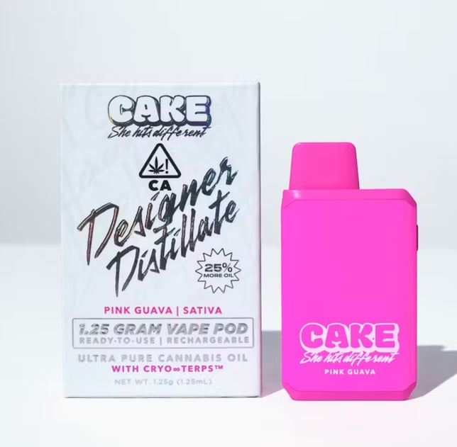 Introducing Designer Distillate by CAKE She Hits Different. Embark on an interstellar journey with our game-changing 1.25 gram all-in-one cosmic vape pod. 25% More oil. 90%+ total cannabinoids. 1,000mg THC. Three designer colors. Transcend boundaries and experience the outer realms of style and potency. Pink Guava [ Sativa ] Mother Nature's exotic elixir. A perfectly balanced fusion of bold sweetness and subtle tang, awakens the palate.Introducing Designer Distillate by CAKE She Hits Different. Embark on an interstellar journey with our game-changing 1.25 gram all-in-one cosmic vape pod. 25% More oil. 90%+ total cannabinoids. 1,000mg THC. Three designer colors. Transcend boundaries and experience the outer realms of style and potency. Pink Guava [ Sativa ] Mother Nature's exotic elixir. A perfectly balanced fusion of bold sweetness and subtle tang, awakens the palate.