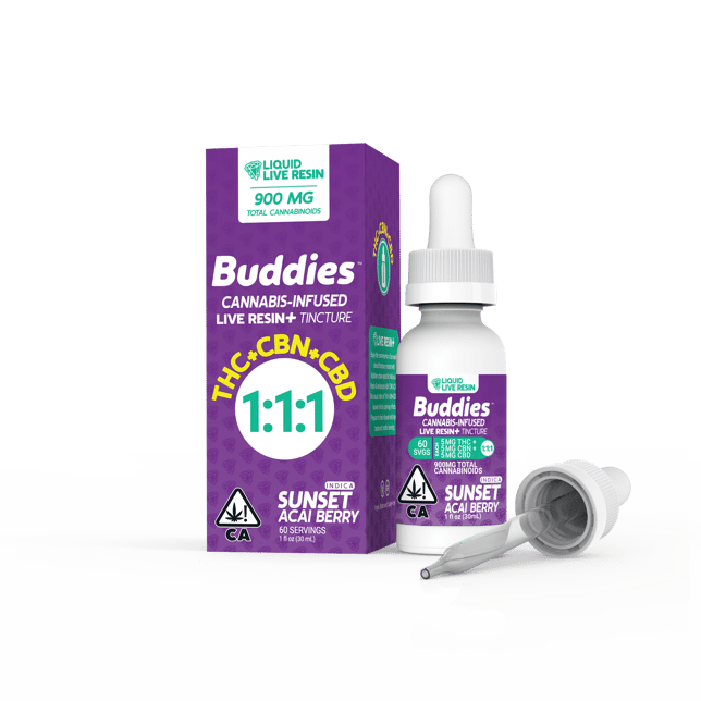 Get the sound sleep you deserve with our Sunset 1:1:1 tincture! Buddies Liquid Live Resin+ Tinctures offer a delicious way to enjoy our indica strain-specific Live Resin blended with CBN & CBD for even greater effects and benefits. Customize your perfect dose with the included measured dropper and enjoy as a sublingual or mixed with your favorite beverage. Expertly formulated with a 1:1:1 ratio of THC to CBN to CBD, these tinctures are tailored to provide support to end your day. Ready to rest? Savor the soothing taste of Açai Berry while enjoying sustained relief and relaxation.