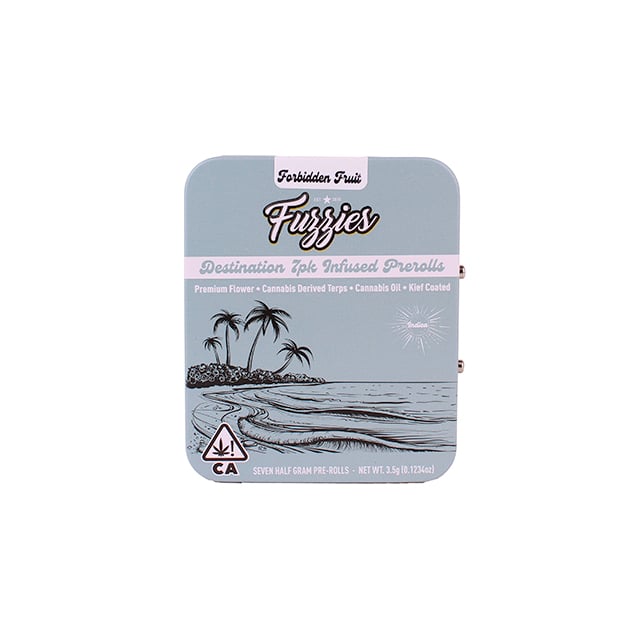 Set out on a California adventure with our Fuzzies Destination 7-Pack prerolls. Each sleek tin contains seven handcrafted .5G prerolls, made from single-source whole nug flower, infused with premium cannabis oil, and coated in golden kief. With a total of 3.5G, this pack is your passport to exploring the coast, desert, and forests—one perfect puff at a time.