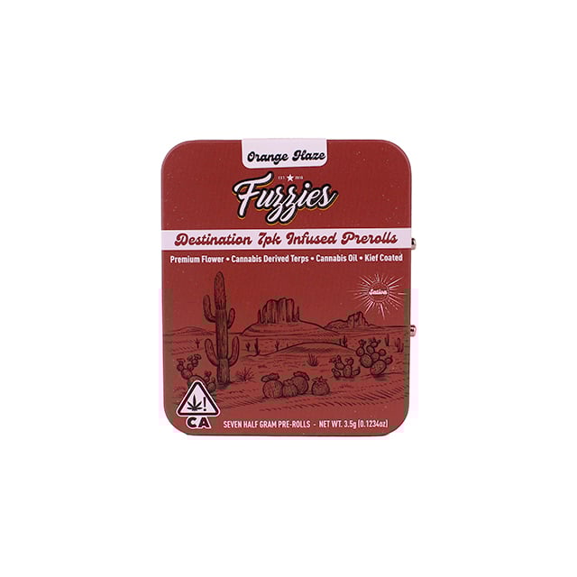 Set out on a California adventure with our Fuzzies Destination 7-Pack prerolls. Each sleek tin contains seven handcrafted .5G prerolls, made from single-source whole nug flower, infused with premium cannabis oil, and coated in golden kief. With a total of 3.5G, this pack is your passport to exploring the coast, desert, and forests—one perfect puff at a time.