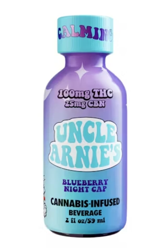 Knock out with the travel sized Uncle Arnie's 100mg THC Blueberry Night Cap Shot. This two ounce shot is infused with 25mg of CBN, a cannabinoid known to help you wind down. Feel relaxed knowing you have a night cap waiting for you after a long day at work. Just like the classic 8 ounce drinks, these are infused with nano-emulsion technology. You can control your high or get as lit as you want by using the dosed measurement system. Expect your rocket to blast off in 20-40 minutes.Knock out with the travel sized Uncle Arnie's 100mg THC Blueberry Night Cap Shot. This two ounce shot is infused with 25mg of CBN, a cannabinoid known to help you wind down. Feel relaxed knowing you have a night cap waiting for you after a long day at work. Just like the classic 8 ounce drinks, these are infused with nano-emulsion technology. You can control your high or get as lit as you want by using the dosed measurement system. Expect your rocket to blast off in 20-40 minutes.