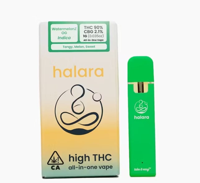 WatermelonZ OG, Indica 90+% THC | <2% CBD | CBG Inspired by Watermelon OG Flavor: Mouthwatering watermelon sugar with ripe, refreshing watermelon, a hint of tangy zest, and a smooth, creamy finish. Bold, fruity flavor with an extra kick. Bursting with the mouthwatering taste of sugary watermelon, WatermelonZ OG delivers a deliciously sweet and juicy flavor with every inhale. This vape captures the essence of summertime nostalgia—ripe, refreshing watermelon with a hint of tangy zest, balanced by a smooth, creamy finish. Perfect for those who love bold, fruity flavors with a little extra kick, it’s as tasty as it is potent. Aroma: Tropical watermelon candies Feeling: Relaxed and Euphoric Top Terpenes: delta-limonene, beta-Caryophyllene, alpha-Bisabolol Consistent and pure. The high potency you want with crafted terpene blends for excellent flavor. Distillate done right. The exceptional oil quality you expect from Halara, now in an all-in-one ready for life’s adventures. Auto-draw - no on/off button. Comes charged - rechargeable with USB-C cable. Features two carb holes on side of device - cover one for bigger hits and improved airflow. Grab one and go! When you are done, don’t forget to recycle your vape cartridge through our recycling program. Find your closest partner retailer on our locator map: https://www.google.com/maps/d/u/0/edit?mid=1PHAB1coFwCKMIMVuXBK0Fs2G6OFtbO8&usp=sharing Learn more about our Recycling Program here: https://www.gohalara.com/recycling-program Remember: An empty integrated cannabis vaporizer shall be properly disposed of as hazardous waste at a household hazardous waste collection facility or other approved facility. Flavors Sweet Tropical Strawberry Effects & flavors are reported by users on our site. This is for informational purposes only and not intended as medical advice. Please consult your physician before changing any medical treatment.