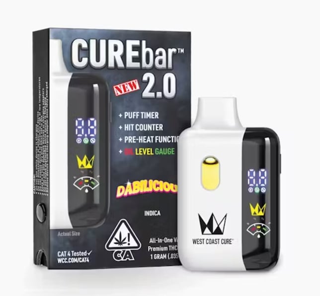 WCC's Dabilicious Ready-To-Use CUREbar 2.0 is where nostalgia meets potency! A hit from the past with its old-school blast from the past, this 1-gram tank of Indica oil creates a deliciously strong experience. Offering the perfect blend of retro vibes with modern strength – it's a heady trip down memory lane with a twist of clarity.WCC's Dabilicious Ready-To-Use CUREbar 2.0 is where nostalgia meets potency! A hit from the past with its old-school blast from the past, this 1-gram tank of Indica oil creates a deliciously strong experience. Offering the perfect blend of retro vibes with modern strength – it's a heady trip down memory lane with a twist of clarity.