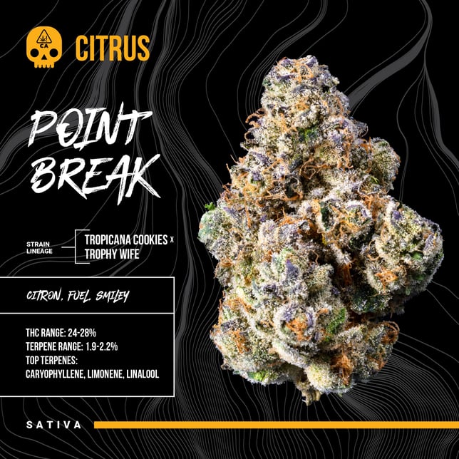 Point Break is straight-up Citrus fire—Citron and gas on the nose, with a,fruity smoke that hits smooth. These dense, frosty green nugs (with a little purple flex) bring on a smiley, euphoric high. Expect a red eye flight, That will perk you up and keep ya going. Perfect for getting those chores done.