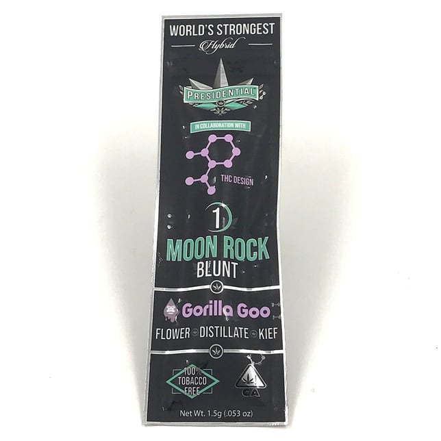 Presidential X THC Design Collaboration | Gorilla Goo Presidential Blunt | Moon Rock Infused | 1.5 Gram | Your Presidential Moon Rock Preroll consist of estate grown, single sourced flower cultivated by the award-winning THC Design. The flower is then INFUSED with premium distillate, using Presidential’s proprietary infusion process that enables us to permeate the flower to the stem. Finally, it is coated in the highest quality kief, creating the slowest burning, most potent Moon Rocks on the market! Ground and rolled For Your Enjoyment!Presidential X THC Design Collaboration | Gorilla Goo Presidential Blunt | Moon Rock Infused | 1.5 Gram | Your Presidential Moon Rock Preroll consist of estate grown, single sourced flower cultivated by the award-winning THC Design. The flower is then INFUSED with premium distillate, using Presidential’s proprietary infusion process that enables us to permeate the flower to the stem. Finally, it is coated in the highest quality kief, creating the slowest burning, most potent Moon Rocks on the market! Ground and rolled For Your Enjoyment!
