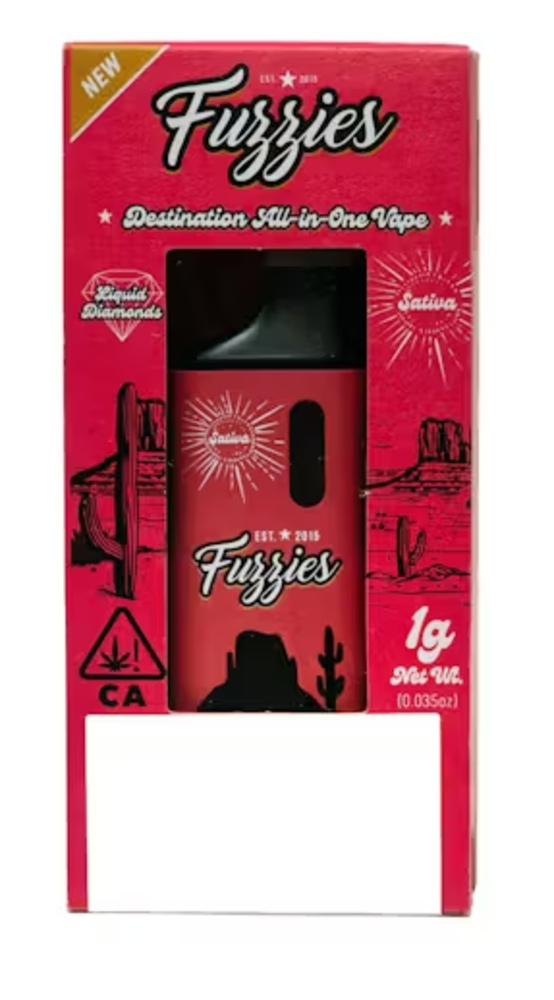 Fuzzies 1g Destination All-In-One Vapes are made with Liquid Diamonds and Live Resin Terpenes deliverying a smooth and flavorful high for a trip in the clouds. This small but mighty hardware is postless, with a V-shaped oil resevoir for no oil loss and a cermaic heating core for the perfect even burn throughout. Small enough to take anywhere and built for big rips with long lasting battery life, that's USB-C rechargeable. Enjoy your destination.Fuzzies 1g Destination All-In-One Vapes are made with Liquid Diamonds and Live Resin Terpenes deliverying a smooth and flavorful high for a trip in the clouds. This small but mighty hardware is postless, with a V-shaped oil resevoir for no oil loss and a cermaic heating core for the perfect even burn throughout. Small enough to take anywhere and built for big rips with long lasting battery life, that's USB-C rechargeable. Enjoy your destination.