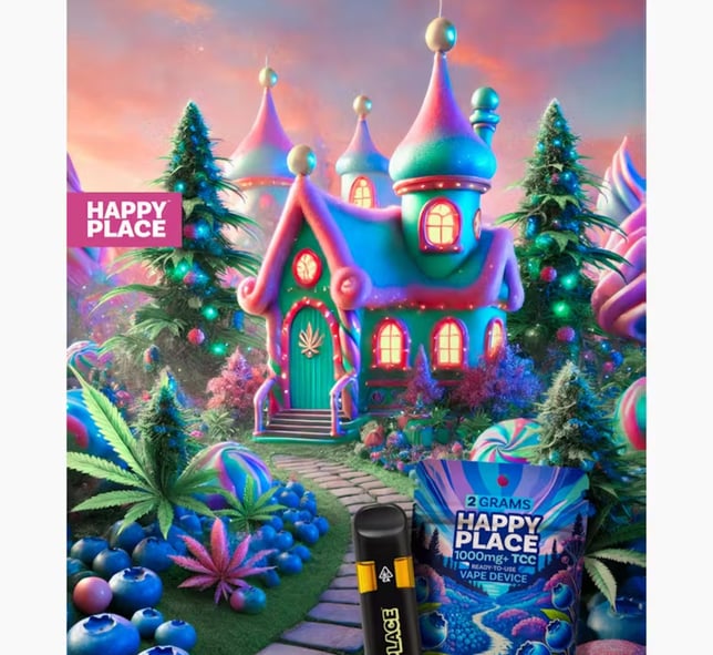 A Berry Lover’s Dream Explode your senses with Blueberry Bomb, packed with rich, juicy blueberry flavors and just the right amount of tartness. This perfectly balanced vape is a must-try for any berry lover, offering a sweet and slightly tangy experience that will leave you craving more. Flavor Profile: *Rich and juicy blueberry *Slightly tart berry undertones *Sweet, satisfying burst of flavor Effects: *Calming and stress-relieving *Eases tension with a subtle boost of joy *Great for unwinding after work Get High. Get Happy. Find Your Happy Place. At Happy Place, we believe cannabis is more than a product—it’s your gateway to better days, brighter moods, and unforgettable experiences. Our mission is simple: to help you find your Happy Place, wherever that may be. Why Happy Place? Premium Potency: With over 1000mg+ TCC (Total Cannabinoid Content), our products deliver the powerful, satisfying experience you deserve.Convenience Redefined: Our 2-gram All-In-One vape devices offer long-lasting use and ultimate ease of enjoyment.Unrivaled Flavor: From tropical sweetness to berry-rich goodness, each strain is crafted to tantalize your senses with exceptional taste. Happy Place isn’t just a brand—it’s a lifestyle. Whether you’re seeking energy, creativity, or a little tropical escape, our products are designed to elevate your mood and transport you to your personal paradise. Flavors Blueberry Berry Apple