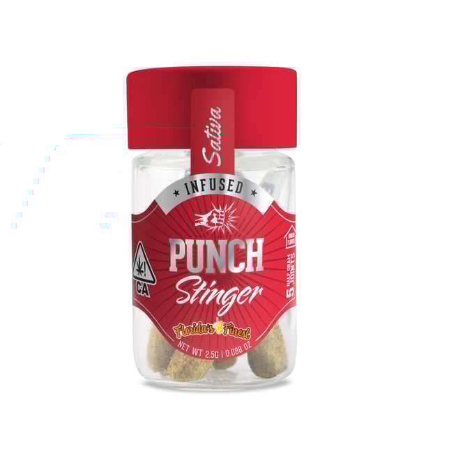 Florida's Finest Punch Stingers delivers a burst of citrusy goodness with each puff, making for a refreshing and delicious smoking experience.The Sativa strain provides a uplifting and energizing high, perfect for daytime use.delivers a burst of citrusy goodness with each puff, making for a refreshing and delicious smoking experience. Elevate your smoking game with our Sativa Florida's finest infused pre-rolls!