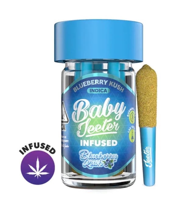 Blueberry Kush Baby Jeeter Infused - Five .50g Joints 2.5g | Indica | 35.20% THC Indoor Grown Infused with Distillate Oil & Kief Blueberry Kush is an indica strain made by crossing Blueberry and OG Kush. This strain produces effects that slowly brings on a heavy body sensation, relaxation and relieves stress. Blueberry Kush is a popular choice for evening use, as its dreamy effects will float you into a deep sleep.Blueberry Kush Baby Jeeter Infused - Five .50g Joints 2.5g | Indica | 35.20% THC Indoor Grown Infused with Distillate Oil & Kief Blueberry Kush is an indica strain made by crossing Blueberry and OG Kush. This strain produces effects that slowly brings on a heavy body sensation, relaxation and relieves stress. Blueberry Kush is a popular choice for evening use, as its dreamy effects will float you into a deep sleep.