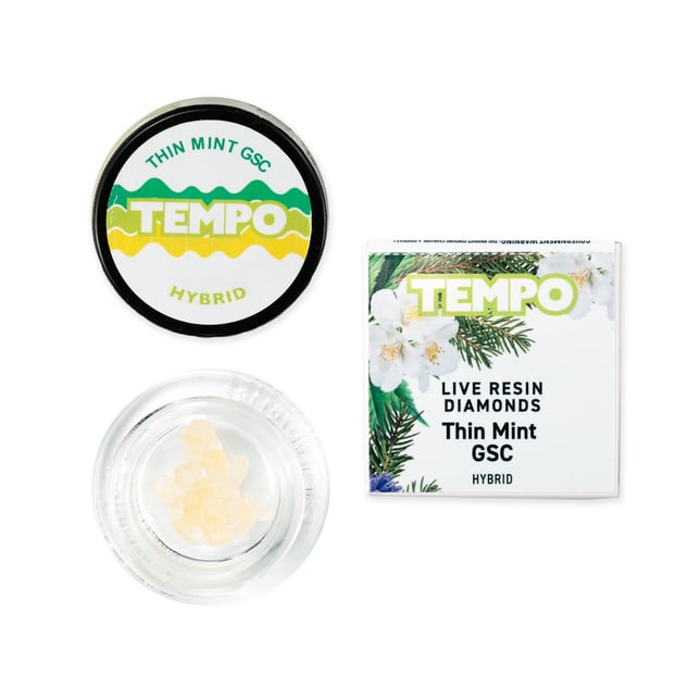 Tempo’s Thin Mint GSC Live Resin Diamonds deliver a harmonious hybrid experience with sweet mint and dank flavors and aroma. acked with Caryophyllene and Pinene, this potent concentrate offers a balanced blend of relaxation and uplifting mental clarity.