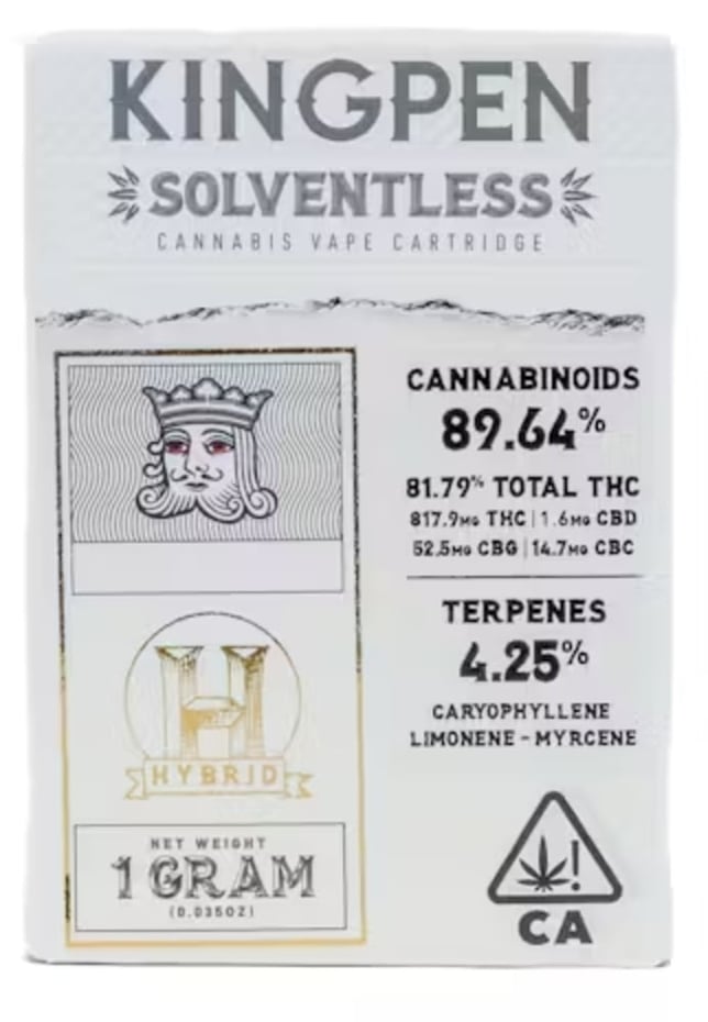 100% Pure Live Rosin! Kingpen Solventless brings you an enhanced experience, allowing you to enjoy the purest expression of the strain on the go. Extracted solely with ice, water and pressure, solventless retains the peak terpene profiles and other essential compounds of each cultivar. Experience the aroma and flavor from small batch, craft cannabis. ¬¬¬ Flavors Earthy Diesel CitrusDoses: 1 G