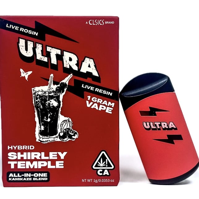 From the makers of CLSICS: Our unique blend of rosin and resin cannabis extracts are the result of extensive research and an unyielding passion for pushing boundaries. Step into the future with a twist on a timeless classic—Shirley Temple. This All-In-One vape takes you back to the iconic and fizzy flavors of the legendary mocktail, but with a kick that's all its own. Crafted from a perfect blend of live rosin and live resin, Shirley Temple offers a burst of cherry and citrus, balanced with a hint of effervescent sweetness that'll leave your taste buds buzzing.From the makers of CLSICS: Our unique blend of rosin and resin cannabis extracts are the result of extensive research and an unyielding passion for pushing boundaries. Step into the future with a twist on a timeless classic—Shirley Temple. This All-In-One vape takes you back to the iconic and fizzy flavors of the legendary mocktail, but with a kick that's all its own. Crafted from a perfect blend of live rosin and live resin, Shirley Temple offers a burst of cherry and citrus, balanced with a hint of effervescent sweetness that'll leave your taste buds buzzing.