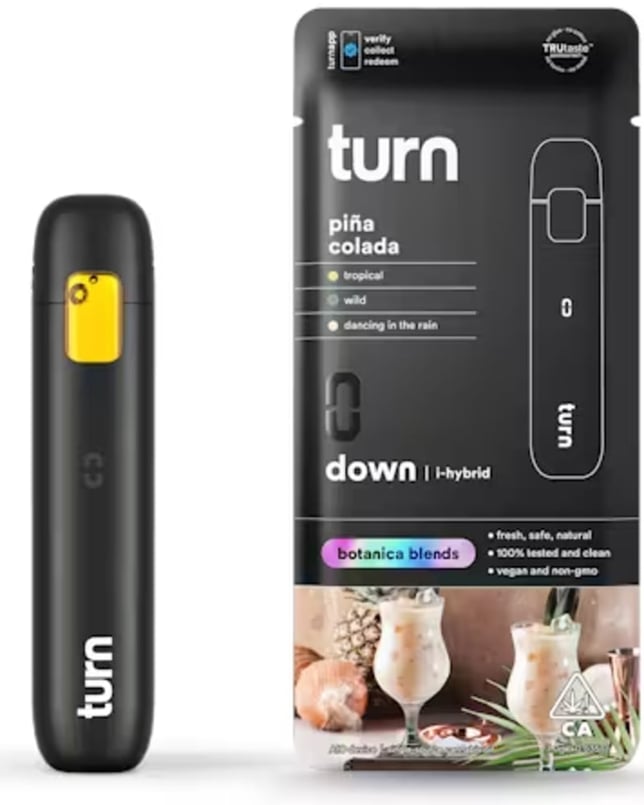 Pack your seersucker shorts; we’re heading to warm shores! Sweet, creamy coconut and a dash of pineapple take taste buds to a tropical paradise alongside a similarly dreamy aroma with the flavor of Havana's uninhibited nightlife. Expect energizing effects ideal for exploring a foreign city. If you like piña coladas… piña colada - wild - dancing in the rain turn botanica blends You'll only get clean, fresh, guaranteed pure California goodness from seed to pen. Choose from a wide selection of our high potency, exclusive, hand-curated botanica blend formulations to get the perfect floaty feeling you're looking for. // oil highlights // Single source California fresh grown Tested and verified clean Vegan, non-GMO, ultra pure Natural botanical terpenes turnpen disposables pack a big punch. With abundant clouds, consistent pulls, and 100% live window view, this pen is practically perfect in every way. No cotton, glue, or heavy metals - ever. Free and easy airflow, 1.0 ml oil capacity, USB-C rechargeable, 150 puffs per charge, 1-year disposable, LED display, and clearview window so you never miss a drop. Powerful to the last puff, clean, convenient, pocket-comfy, with no buttons, no BS.Pack your seersucker shorts; we’re heading to warm shores! Sweet, creamy coconut and a dash of pineapple take taste buds to a tropical paradise alongside a similarly dreamy aroma with the flavor of Havana's uninhibited nightlife. Expect energizing effects ideal for exploring a foreign city. If you like piña coladas… piña colada - wild - dancing in the rain turn botanica blends You'll only get clean, fresh, guaranteed pure California goodness from seed to pen. Choose from a wide selection of our high potency, exclusive, hand-curated botanica blend formulations to get the perfect floaty feeling you're looking for. // oil highlights // Single source California fresh grown Tested and verified clean Vegan, non-GMO, ultra pure Natural botanical terpenes turnpen disposables pack a big punch. With abundant clouds, consistent pulls, and 100% live window view, this pen is practically perfect in every way. No cotton, glue, or heavy metals - ever. Free and easy airflow, 1.0 ml oil capacity, USB-C rechargeable, 150 puffs per charge, 1-year disposable, LED display, and clearview window so you never miss a drop. Powerful to the last puff, clean, convenient, pocket-comfy, with no buttons, no BS.