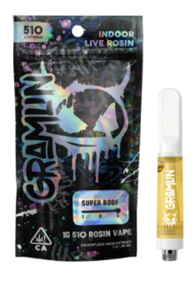 Gramlin 510 Rosin carts are fire in, fire out at its finest. Super Boof’s terp profile blends fermented fruit and tart citrus by crossing Tropicanna Cookies x Black Cherry Punch that’ll uplift your mood and your high. Taste the terps with a fully ceramic system designed to protect each strain’s unique terp profile. Our solventless rosin is pressed from ice water hash that’s extracted from fresh-frozen indoor flower straight out of our grow. We are the growers. We are the processors. We control the run from seed to press to put fire flavor in every cart.