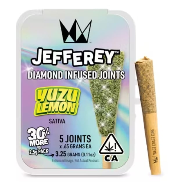 Citrus with a kick. Zesty, bright, and dialed in for anytime elevation, Yuzu Lemon brings a sharp citrus edge to WCC’s signature Jefferey 5-Pack. Each 1.2g pre-roll is infused with THCa diamonds & kief wrapped around premium flower for a smooth burn flavor. Expect bold yuzu up front with thick tangy lemon and a touch of floral bitterness, followed by a clean, sour-sweet exhale that lingers. It's tart, punchy, and refreshingly loud.Citrus with a kick. Zesty, bright, and dialed in for anytime elevation, Yuzu Lemon brings a sharp citrus edge to WCC’s signature Jefferey 5-Pack. Each 1.2g pre-roll is infused with THCa diamonds & kief wrapped around premium flower for a smooth burn flavor. Expect bold yuzu up front with thick tangy lemon and a touch of floral bitterness, followed by a clean, sour-sweet exhale that lingers. It's tart, punchy, and refreshingly loud.