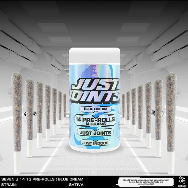 Blue Dream is a classic, sativa cannabis strain known for its balanced effects and versatile appeal by Seven G 14 pre-rolled joints, Just Joints, Just Indoor