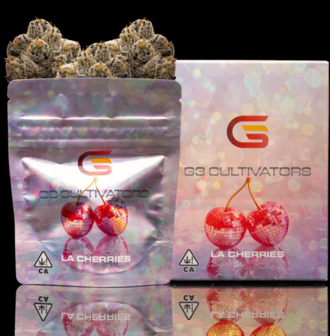 LA Cherries (LAC) is an indica-dominant hybrid celebrated for its sweet, candy-like flavor profile layered with hints of vanilla and berry. The aroma is just as decadent - sugary, fruity, and slightly creamy - making it a standout on any shelf. The high delivers a balanced mix of euphoria and relaxation: an uplifting, creative headspace pairs seamlessly with a calming body buzz, perfect for the winding down without losing focus or good energy. Visually, LA Cherries impresses with chunky, bright purple buds coated in glistening trichomes and highlights by vibrant oranges hairs, giving it a frosty, eye-catching bag appeal. Its dominant terpenes - limonene, caryophyllene, linalool, and humulene - creates a flavorful, aromatic smoke that soothes the bidy while uplifting the mind. Whether for daytime creativity or evening relaxation, LA Cherries is a true candy - flavored classic that embodies the quality and craftsmanship G3 Cultivators is known for.LA Cherries (LAC) is an indica-dominant hybrid celebrated for its sweet, candy-like flavor profile layered with hints of vanilla and berry. The aroma is just as decadent - sugary, fruity, and slightly creamy - making it a standout on any shelf. The high delivers a balanced mix of euphoria and relaxation: an uplifting, creative headspace pairs seamlessly with a calming body buzz, perfect for the winding down without losing focus or good energy. Visually, LA Cherries impresses with chunky, bright purple buds coated in glistening trichomes and highlights by vibrant oranges hairs, giving it a frosty, eye-catching bag appeal. Its dominant terpenes - limonene, caryophyllene, linalool, and humulene - creates a flavorful, aromatic smoke that soothes the bidy while uplifting the mind. Whether for daytime creativity or evening relaxation, LA Cherries is a true candy - flavored classic that embodies the quality and craftsmanship G3 Cultivators is known for.