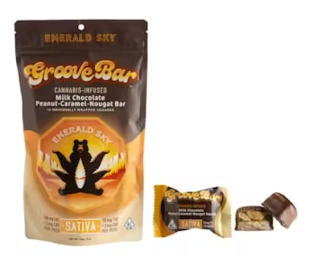 Emerald Sky, California's top chocolate brand, introduces the GrooveBar—a thrilling revival of a classic! This treat combines roasted peanuts, creamy caramel, rich nougat, and silky chocolate, all harmoniously infused with premium cannabis extract. Emerald Sky, California's top chocolate brand, introduces the GrooveBar—a thrilling revival of a classic! This treat combines roasted peanuts, creamy caramel, rich nougat, and silky chocolate, all harmoniously infused with premium cannabis extract.