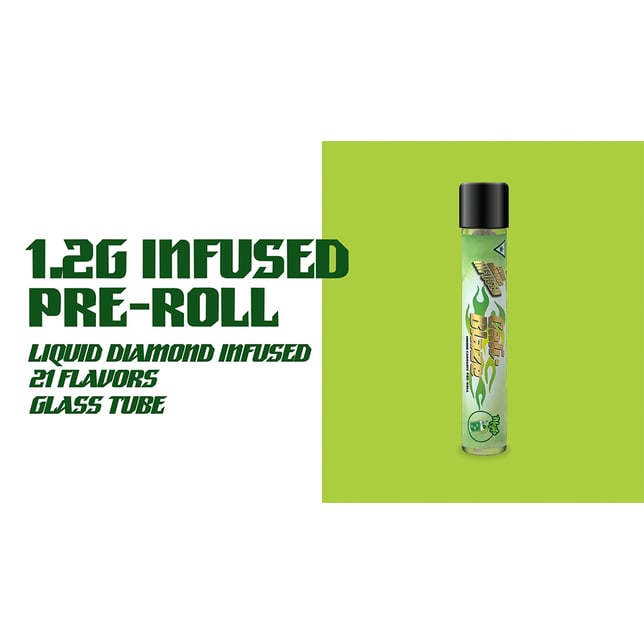 A Cali-Blaze classic! The go-to smoke for many infused preroll lovers. This is a 1-gram joint injected with 200 mg of liquid diamond concentrate and kissed with one of 24 signature flavors. A smoking experience that delivers on potency and taste.