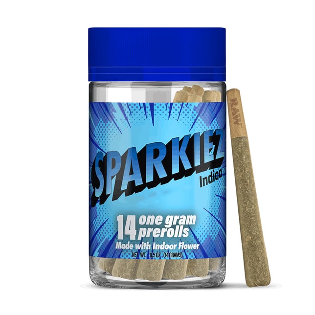 We take 14 grams (½ Ounce) of beautiful indoor flower, no trim, no shake, and roll it into 14 ready to spark pre-rolls. Ready. Set. It's Sparkiez time! Each pre-roll contains 1G of flower.