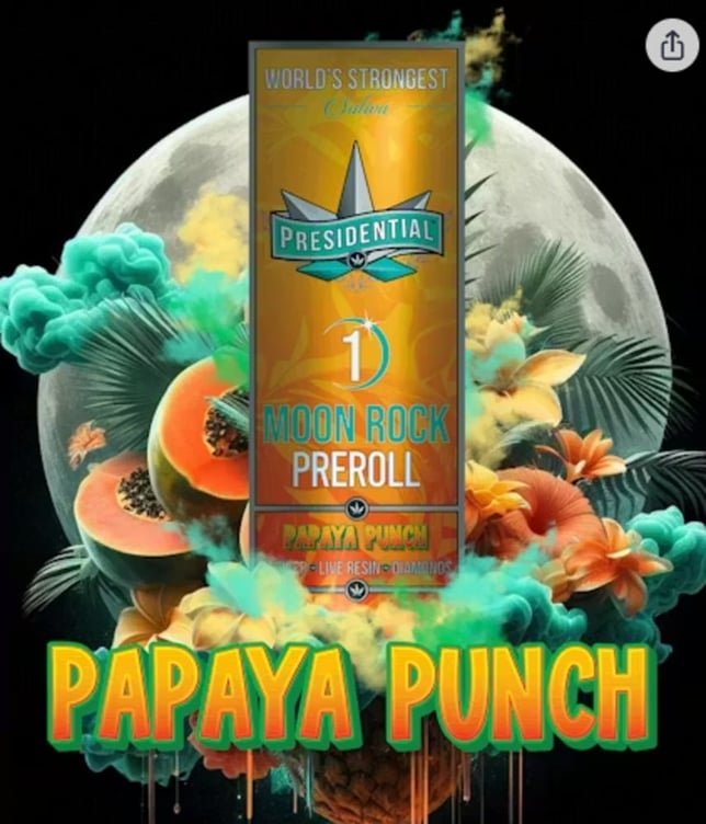 Your Presidential Moon Rock Preroll consists of Indoor Craft Cannabis. The cannabis is then INFUSED with premium Liquid Live Resin, using Presidential’s proprietary infusion process that enables us to permeate the flower to the stem. Finally, it is coated in the highest quality Diamonds, creating the slowest burning, most potent Moon Rocks on the market! Our Prerolls are ground and rolled for your enjoyment! Presidential is committed to creating the most innovative, highest quality cannabis products guaranteed to deliver a reliable and consistent dose with each use. Flavors Berry Cheese Pungent