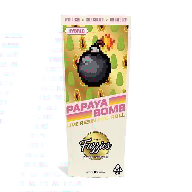 Papaya Bomb levels up with tropical sweetness and balanced hybrid effects that hit like a perfectly timed combo. Infused with live resin oil and rolled in golden kief, this pre-roll is your ultimate flavor bomb.