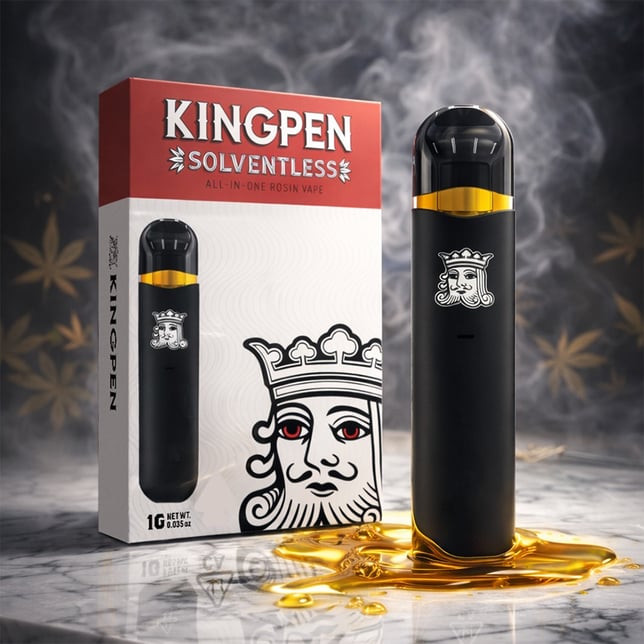 Crafted from small-batch flower and extracted using only ice, water, and pressure, the Kingpen Solventless All-In-One delivers a refined experience in a convenient, portable format.