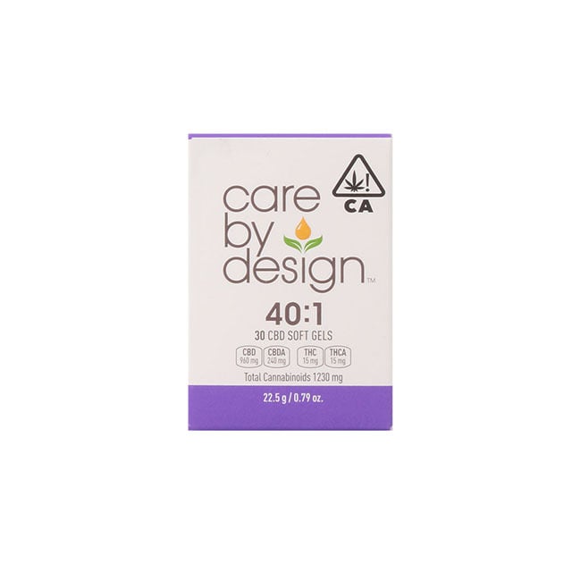 Need comfort on-the-go? Care By Design's full-spectrum CBD 40:1 gel capsules offer a simple addition to one's wellness routine. Take in the morning with a healthy breakfast to feel calm throughout the day, or before bedtime for a restful night’s sleep. Featuring their newest and most relaxing CBD-focused ratio, the 40:1 gel capsules are perfect for precision dosing. They have formulated this ratio specifically to be minimally psychoactive, making it great for those who have little to no experience with cannabis. This formula includes minute amounts of THC and THCA, as well as CBDa in order to amplify your CBD wellness. Perfect for soothing temporary stress and promoting well-being throughout the day. Their goal with the 40:1 was to formulate the most relaxing ratio ever, so whether you want whole-body relief or need some help in the sleep department, this ratio won’t disappoint.Doses: 30