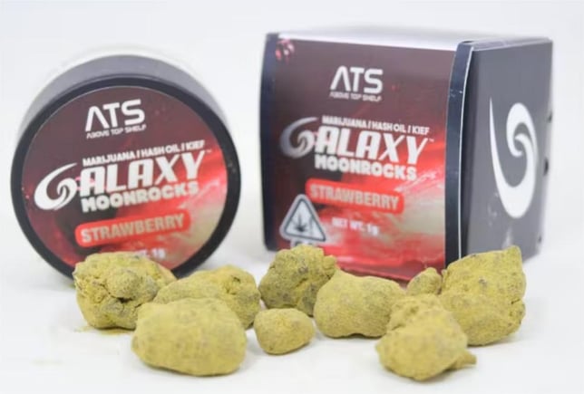 Above Top Shelf Galaxy's Strawberry Moonrock is a highly potent flower layered with heavy amounts of keif to deliver an exceptional head and body high. Many enjoy this infused flower, which carries a sweet fruity flavor, for its powerful-hitting effects that relieve many users of common health issues such as stress, pain and anxiety in ways other medicine can’t.