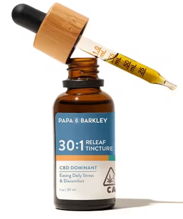 "CBD-dominant oil crafted to promote daily relaxation and overall comfort. The 30:1 Releaf Tincture is high in CBD and low in THC, making it ideal for those seeking a calm state of mind and everyday well-being. This tincture is especially suitable for all cannabis consumers, including beginners, as it provides little to no psychoactive effect. Crafted with only two ingredients—MCT oil and cannabis oil—it offers a fast-acting, natural solution that can be felt within 15 minutes, making it perfect for those seeking a quick, easy-to-use way to support both body and mind. Papa & Barkley’s tinctures are vegan and fast-metabolizing, providing a customizable dosage experience. They are carefully crafted using a whole-plant extraction process. Our solventless, chemical-free infusion method preserves the plant's full spectrum of cannabinoids, terpenes, and phytonutrients for maximum benefits. Product Cannabinoids: 450mg (435mg CBD, 15mg THC) 900mg (875mg CBD, 25mg THC) Product Weight: 15ml (0.5oz) 30ml (1.0oz) Ingredients: MCT Oil, Cannabis Contains: Tree nut (coconut). Does Not Contain: Soy, peanuts, wheat, gluten, dairy, preservatives, artificial colors, artificial flavors, or sweeteners. Directions: Start with a 1.0ml dose placed under the tongue. Hold for at least 20 seconds, then swallow. STRAIN TYPE / PHENOTYPE: Hybrid This statement has not been evaluated by the Food and Drug Administration. This product is not intended to diagnose, treat, cure, or prevent any disease.""CBD-dominant oil crafted to promote daily relaxation and overall comfort. The 30:1 Releaf Tincture is high in CBD and low in THC, making it ideal for those seeking a calm state of mind and everyday well-being. This tincture is especially suitable for all cannabis consumers, including beginners, as it provides little to no psychoactive effect. Crafted with only two ingredients—MCT oil and cannabis oil—it offers a fast-acting, natural solution that can be felt within 15 minutes, making it perfect for those seeking a quick, easy-to-use way to support both body and mind. Papa & Barkley’s tinctures are vegan and fast-metabolizing, providing a customizable dosage experience. They are carefully crafted using a whole-plant extraction process. Our solventless, chemical-free infusion method preserves the plant's full spectrum of cannabinoids, terpenes, and phytonutrients for maximum benefits. Product Cannabinoids: 450mg (435mg CBD, 15mg THC) 900mg (875mg CBD, 25mg THC) Product Weight: 15ml (0.5oz) 30ml (1.0oz) Ingredients: MCT Oil, Cannabis Contains: Tree nut (coconut). Does Not Contain: Soy, peanuts, wheat, gluten, dairy, preservatives, artificial colors, artificial flavors, or sweeteners. Directions: Start with a 1.0ml dose placed under the tongue. Hold for at least 20 seconds, then swallow. STRAIN TYPE / PHENOTYPE: Hybrid This statement has not been evaluated by the Food and Drug Administration. This product is not intended to diagnose, treat, cure, or prevent any disease."