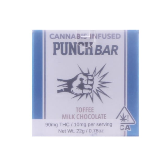 Toffee milk chocolate square made with pieces of toffee and Absolute shatter. The Punch Bar breaks into nine even pieces of about 10 mg for easy dosing.