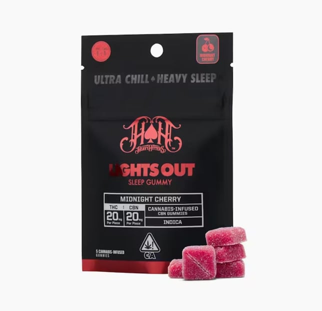 The ultimate knockout. Providing full-body relaxation and mental calmness, Lights Out CBN Sleep gummies put you down gently and keep you asleep throughout the night. A smooth blend of cherry and dark fruit flavors, these gummies are infused with a 1:1 ratio of Heavy Hitters Ultra Extract and pure CBN. CBN, a rare cannabinoid created when THC is exposed to oxygen and light, is famous for its sedative properties. When paired with THC, CBN may provide a better night's rest. 20mg THC | 20mg CBN per piece. Gluten free. Dairy free. Nut free. Using a powerful combination of THC and CBN delivered by the velvety flavor of black cherries, Lights Out Midnight Cherry is the undisputed Heavyweight Champion of night-time confections, pummeling you with right hooks of heavy relaxation and always winning with a stunning KO.Doses: 5