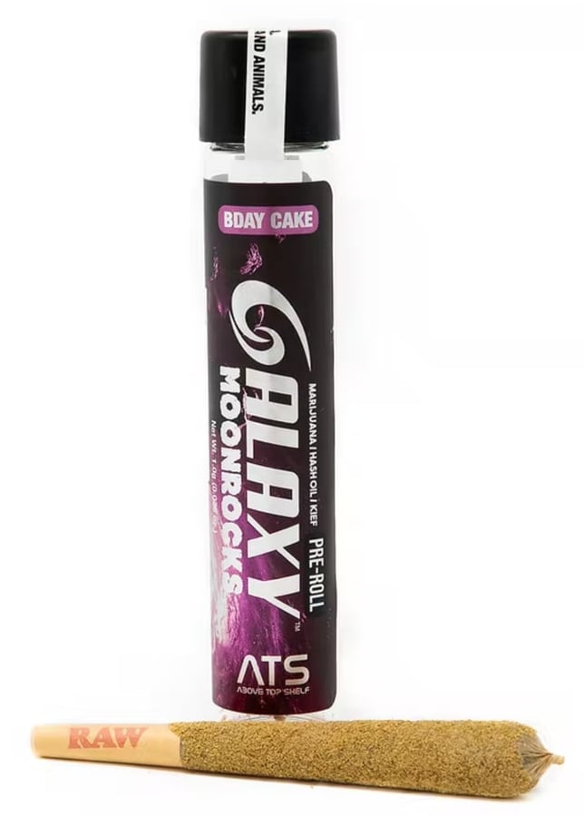 Introducing Above Top Shelf Galaxy's newest preroll addition, the Moonrock Preroll! Brought to you by popular demand, the perfect blend of indoor indica flower mixed with hash oil and rolled in golden kief. Try Galaxy Moonrock Prerolls today for an out of this world experience!!!