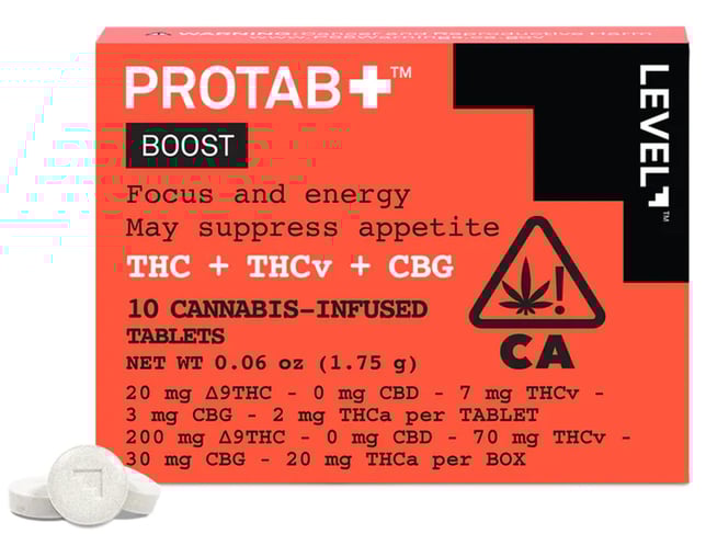 For those times when you need the focus and energy to make it through your day, Boost’s precisely combined highly functional cannabinoids may provide the powerful effect you desire. Each tablet contains 20 mg delta-9 THC, 7 mg THCv, 3 mg CBG, and 2 mg of THCa that take effect in 30–90 minutes, with a duration of 3–6 hours. Don’t assume your normal edible dose is your Protab+ dose. Start with half or one, and then work up from there. LEVEL tablets are scored to be easily split in half. For those times when you need the focus and energy to make it through your day, Boost’s precisely combined highly functional cannabinoids may provide the powerful effect you desire. Each tablet contains 20 mg delta-9 THC, 7 mg THCv, 3 mg CBG, and 2 mg of THCa that take effect in 30–90 minutes, with a duration of 3–6 hours. Don’t assume your normal edible dose is your Protab+ dose. Start with half or one, and then work up from there. LEVEL tablets are scored to be easily split in half.