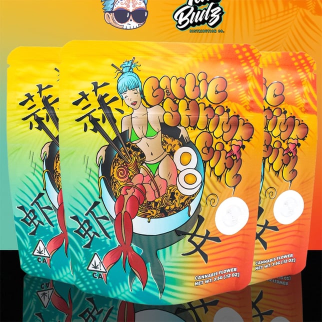 Garlic Shrimp Girl is coming with some power! You ever smoked and got a case of the giggles? Well this here reminds us of that, it brings joyful vibes along with heavy focus and body relaxation. This baby is smoking clean, followed by tasty notes of berries, piney leaves and lemon candy making this a great experience. The buds are layered with frosty trichomes and sticky consistency upon breakdown leaving a sweet aroma of fresh buds in the air. The aroma is sweet , with a lemon peel and fruit punch candy making it a special smoke. With this strain, you get potency and flavor along with the proper lung expansion we all look for, you can smoke it out of bongs, papers or blunts and be able to taste the full terp profile with no issues !