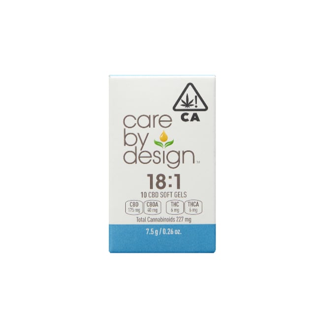 The 18:1 soft gel is perfect for calming occasional stress and supporting a sense of wellbeing throughout the day. These softgels are made for precision dosing. Care By Design's 18:1 soft gel capsules have been a long-time favorite of medical cannabis patients, for good reason! The 18:1 soft gels are packed with CBD in a convenient supplement that can be taken during the day or evening. Typically this ratio results in little to no psychoactivity, but be advised result may vary person to person.