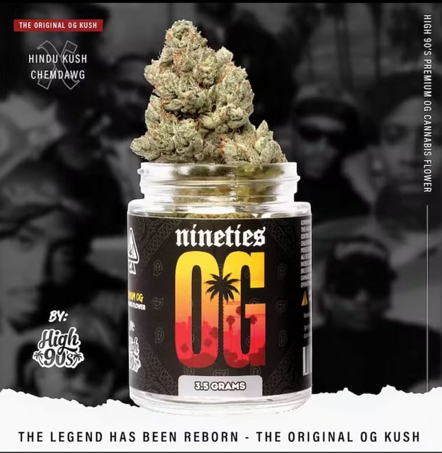 Lineage: Hindu Kush x Chemdawg Top Terpenes: Myrcene, Caryophyllene, Limonene Flavor & Aroma: Lemon, Pine, Fuel Effects: Sleepy, Hungry According to legend, the OG Kush strain came from the Hindu Kush mountains of Afghanistan then smuggled its way to Florida in the ‘90s. Eventually, it found its home in California. Some say ‘OG’ means ‘Ocean Grown’ because it was mastered by growers in the Pacific Coast but here in LA, we call it the Original Gangster. The Nineties OG strain was birthed by High 90’s to pay homage to the legendary west coast staple that became a worldwide phenomenon. A nod to an iconic past, the original OG Kush has won countless awards and dominated the market for decades. This indica dominant strain was created by crossing Hindu Kush and Chemdawg. It boasts a pungent aroma of lemon fused with notes of fuel and spice. Nineties OG is potent, with long-lasting effects combined with a focused head high. Nothing hits harder than the Original OG Kush. Flavors Earthy Strawberry LemonLineage: Hindu Kush x Chemdawg Top Terpenes: Myrcene, Caryophyllene, Limonene Flavor & Aroma: Lemon, Pine, Fuel Effects: Sleepy, Hungry According to legend, the OG Kush strain came from the Hindu Kush mountains of Afghanistan then smuggled its way to Florida in the ‘90s. Eventually, it found its home in California. Some say ‘OG’ means ‘Ocean Grown’ because it was mastered by growers in the Pacific Coast but here in LA, we call it the Original Gangster. The Nineties OG strain was birthed by High 90’s to pay homage to the legendary west coast staple that became a worldwide phenomenon. A nod to an iconic past, the original OG Kush has won countless awards and dominated the market for decades. This indica dominant strain was created by crossing Hindu Kush and Chemdawg. It boasts a pungent aroma of lemon fused with notes of fuel and spice. Nineties OG is potent, with long-lasting effects combined with a focused head high. Nothing hits harder than the Original OG Kush. Flavors Earthy Strawberry Lemon